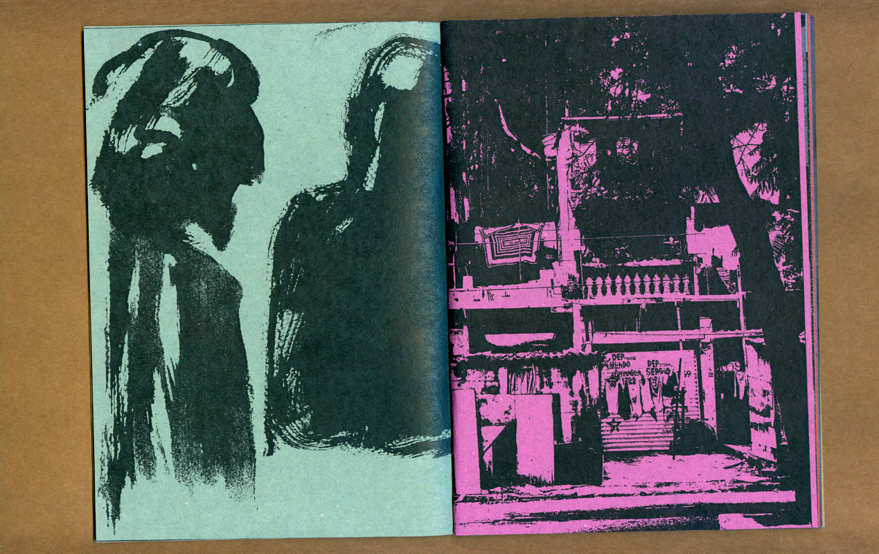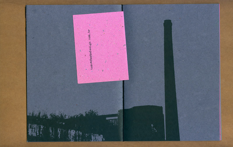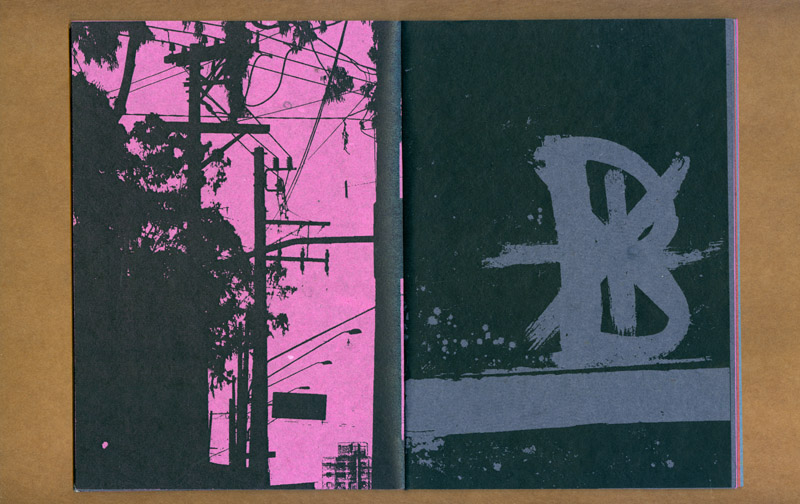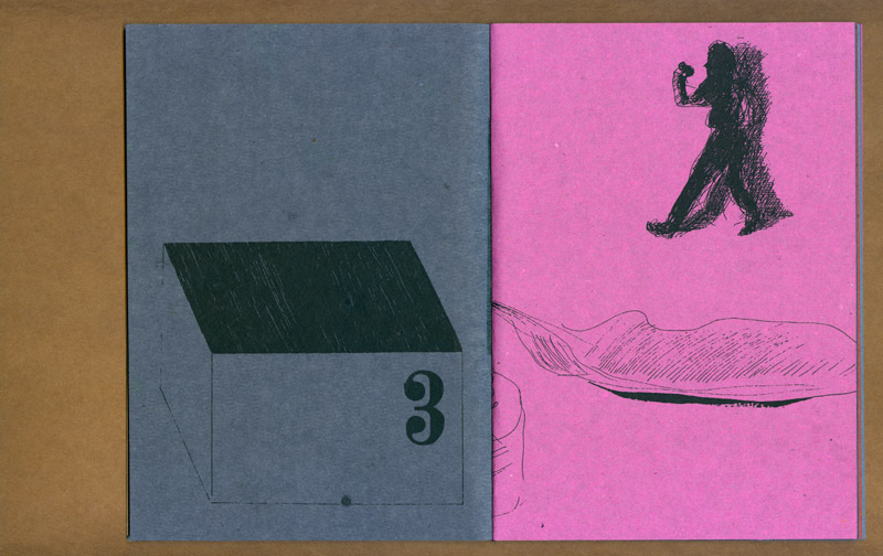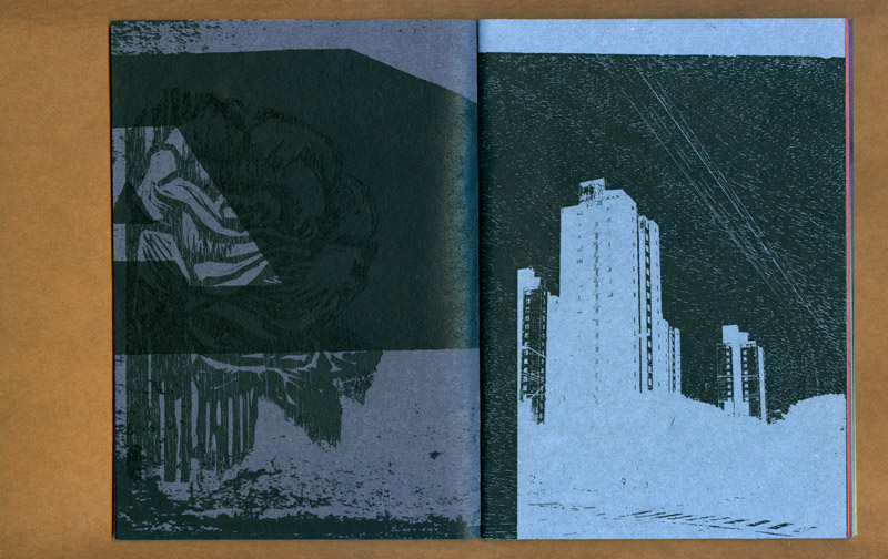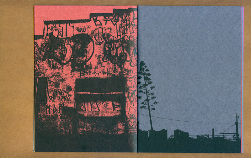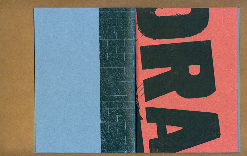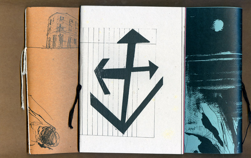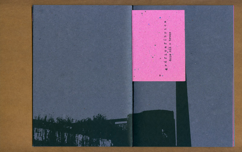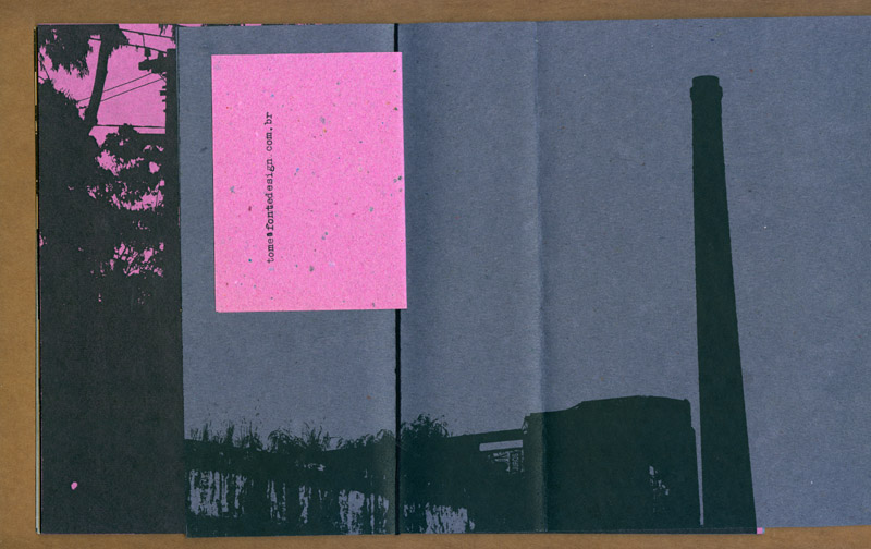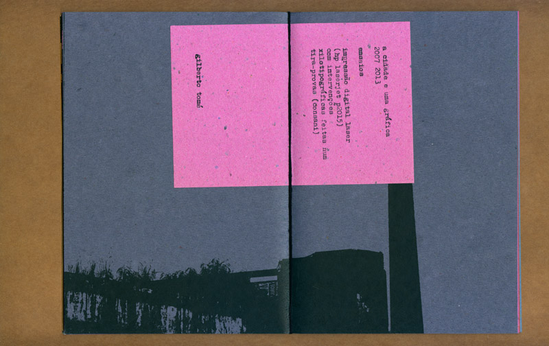 este caderno selecionou várias fotos e desenhos realizados durante o projeto “a cidade e uma gráfica” (que resultaria na edição posterior do caderno-cartaz) experimentando associações livres e variáveis entre as mais de 30 imagens. ¶ tendo sido feita uma tiragem de 100 exemplares, impressa inicialmente numa impressora hp laserjet p2015 com posteriores intervenções xilotipográficas em algumas páginas variadas, através de um tira-provas consani, cada exemplar é absolutamente diferente dos demais na sequência das páginas e na cor do papel (uma mesma imagem foi impressa em papéis com oito cores diferentes, da linha “creative paper”, marca foroni, 80gr/m2). ¶ os cadernos, em formato final fechado a5, são simplesmente encadernados com barbantes sem perfuração, o que possibilita reposicionamento de páginas e novas relações entre imagens. iniciado em 2007, este “caderno de ensaios e ensejos” foi somente apresentado em 2013.